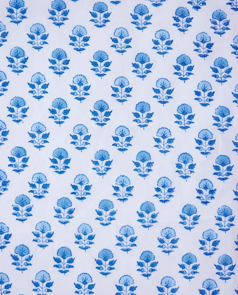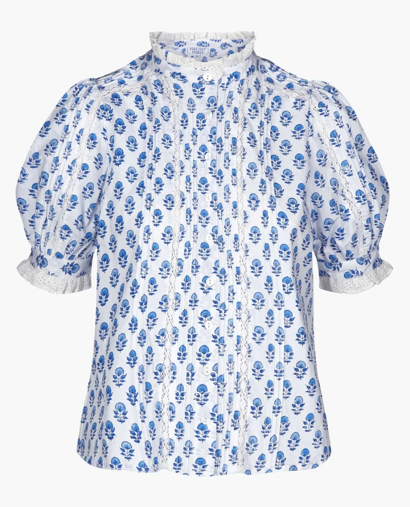 Pink City Prints Vera Sky Buta Blouse, inspired by vintage blouses, the Vera is a wardrobe classic finished with pretty rows of pin-tucks and lace inserts. Block-printed by hand in delicate blue butas onto rich organic poplin. Finished with pretty lace ruffles at the sleeve and collar. Unlined. Relaxed fit.