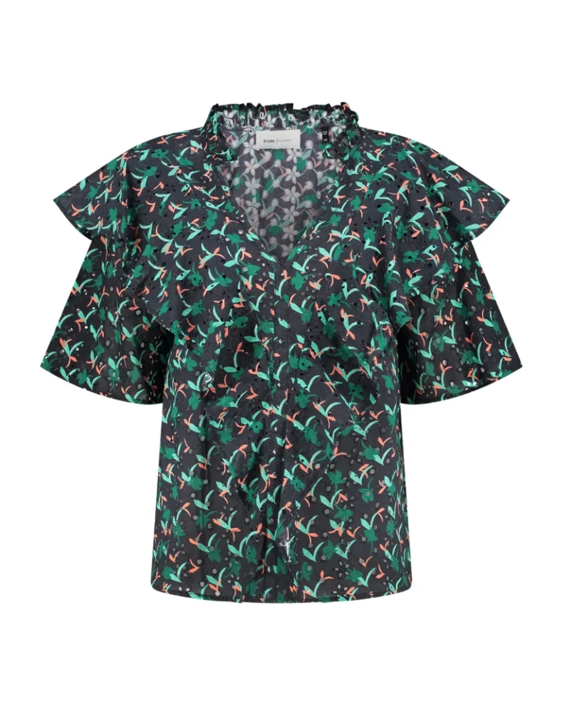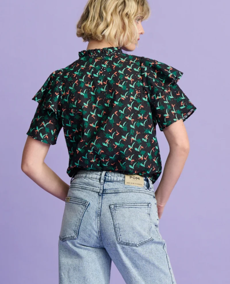 Pom Amsterdam Dreamy Breeze Top, an embroidered black printed top which is made of 100% cotton and has an openwork pattern with a green and orange floral print. The top has a V-neck, ruffles and a flounce down the entire front.