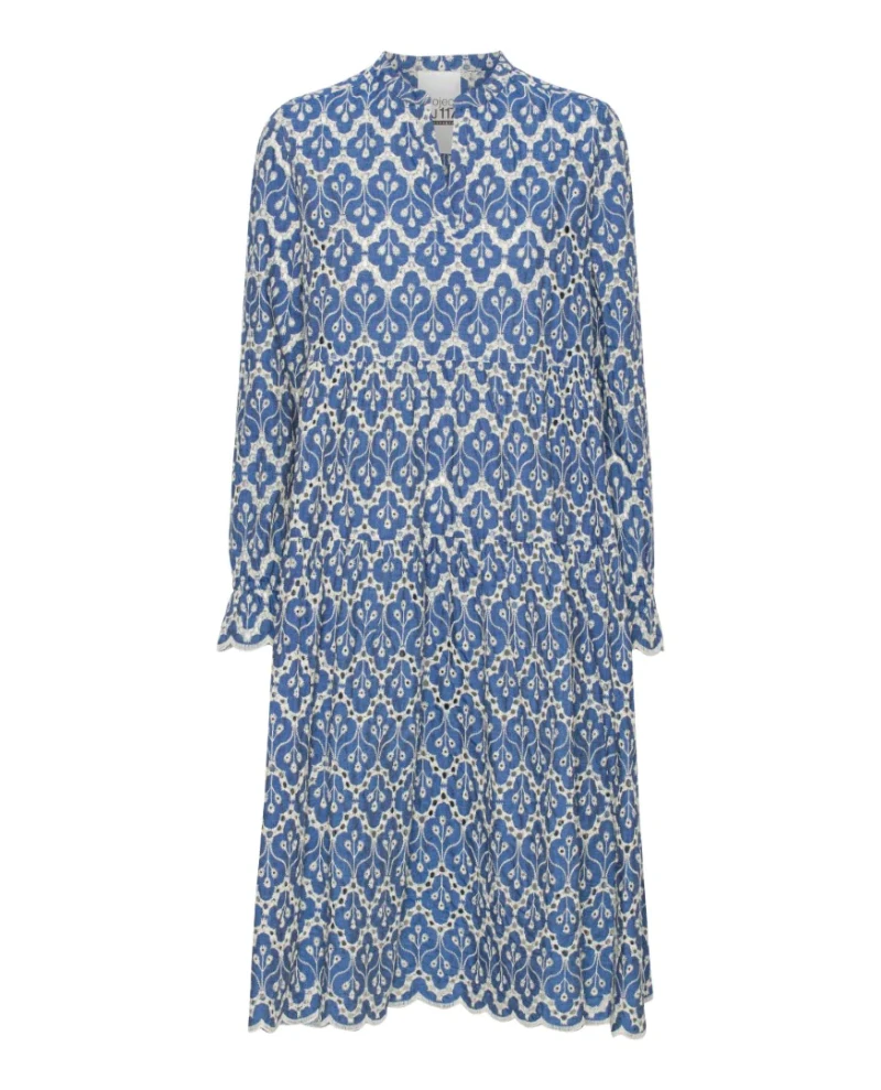 Project AJ117 Lissabon Indigo Dress, a denim dress with embroidered flowers and an embroidered hole pattern. The dress has a loose fit with layers in the skirt and v-neckline. The sleeves are long with elastic at wrist and curved hem. The curves are also embroidered at bottom of skirt.