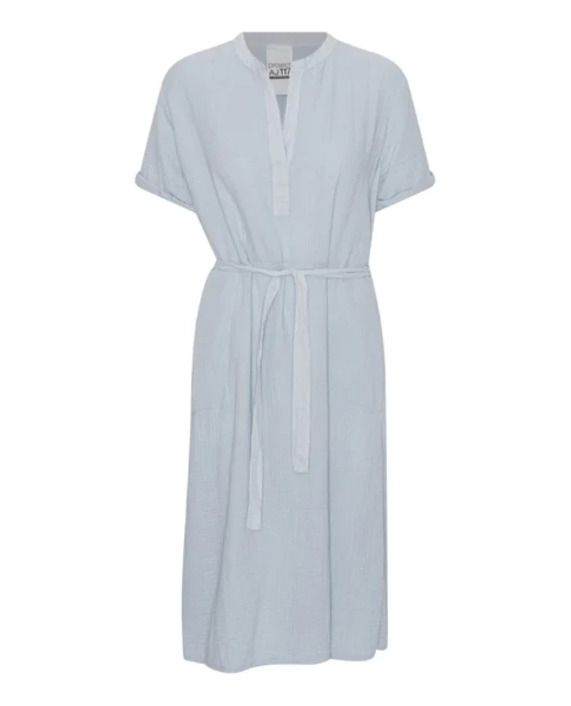 Project AJ117 Shadow Twilight Dress, a pale blue shirt style dress. With loose, short sleeves and a button placket to the front, the Shadow dress has a relaxed fit with tie belt to the waist.