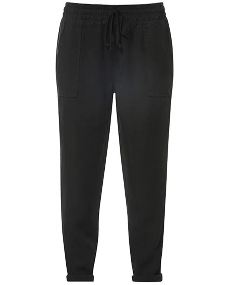 Reiko Military Black Trousers, a black pair of soft cargo pants with a stretchy elasticated waistband and a drawstring tie. Loose fitting with a straight leg and large patch pockets the Military trousers have are incredibly comfortable and also come in green.Â
