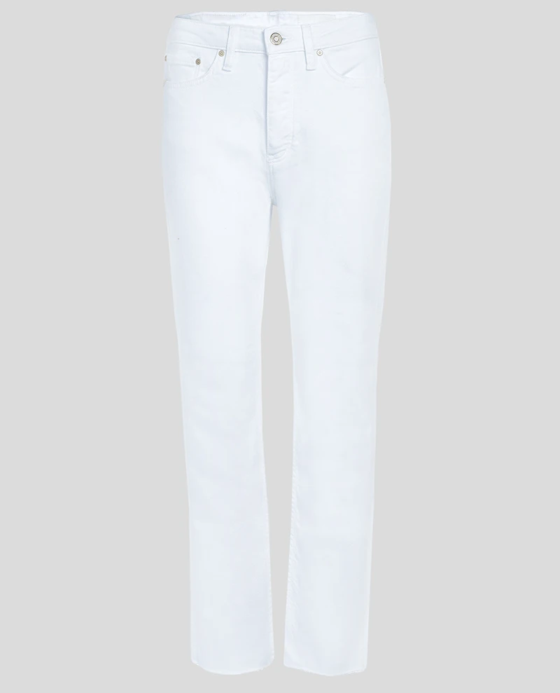Reiko Milo White Jeans, a white pair of straight leg jeans made from eco-friendly denim. Finished with a raw hem at the bottom these comfortable high waisted jeans fasten with 4 buttons. Relaxed and slim, the Milo also comes in denim blue.