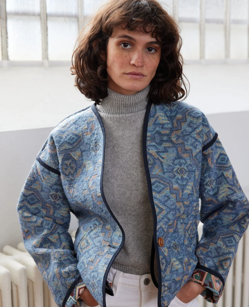 Experience luxury and comfort with the Sacre Coeur Daria Etnico Jacket. Crafted in Italy with fancy jacquard, this low-armhole jacket is unlined and features contrasting braid, a button closure, two back darts, and single piped pockets. Enjoy a stylish look with its short, loose cut.