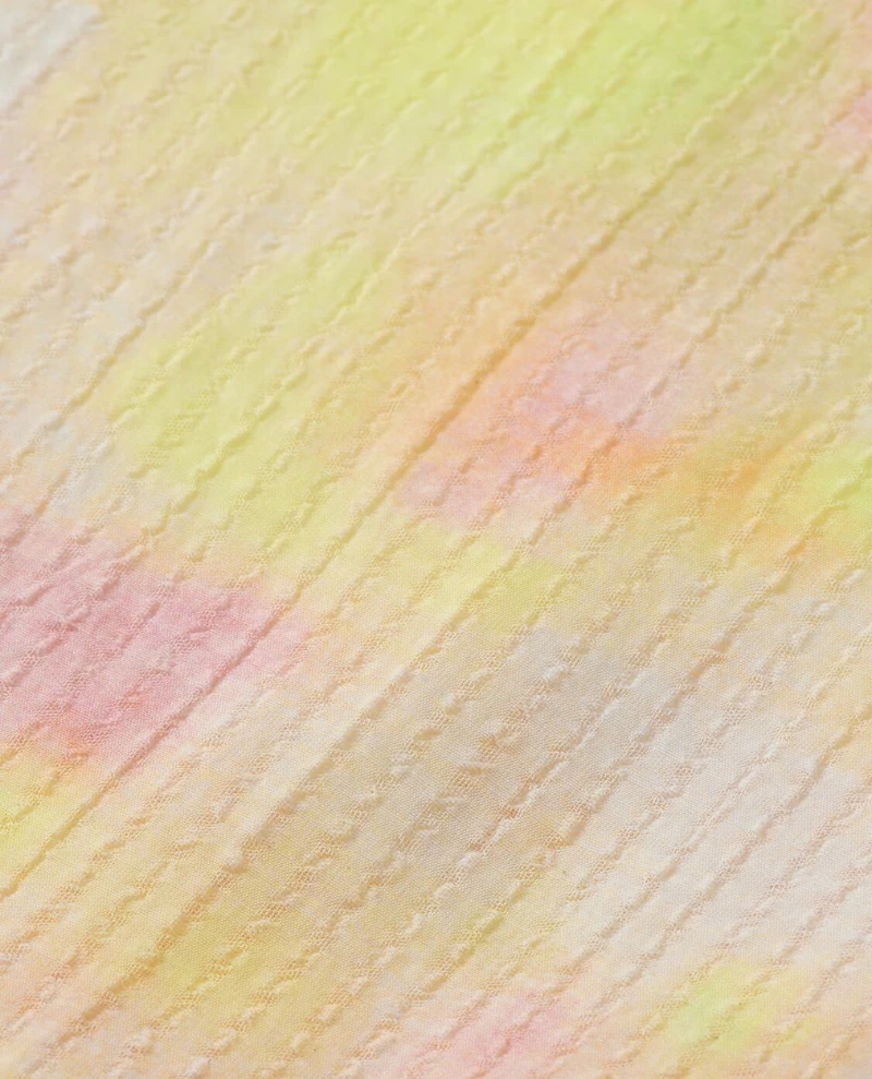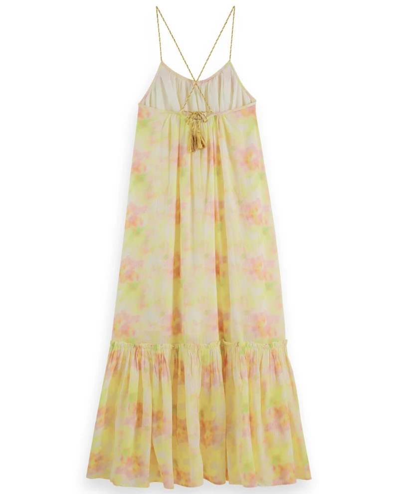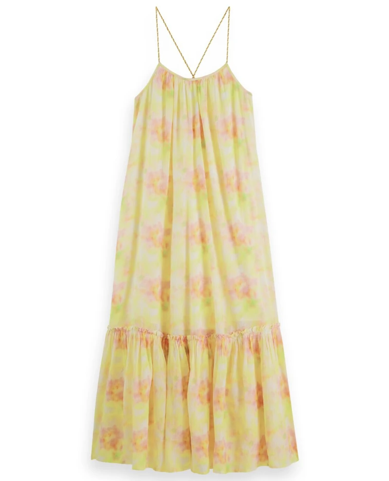 Scotch & Soda Multi Tie Dye Tank Top Maxi Dress, a long and flowing Summer sundress with thin spaghetti straps and an all over floral tie dye print in yellow, green and peach. The braided straps cross over at the back creating a flattering halter neck.