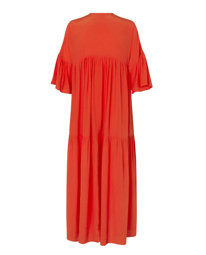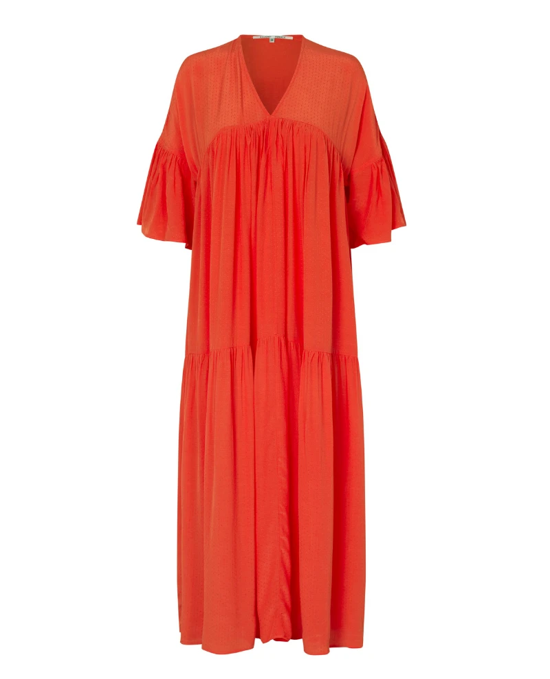 Second Female Emanuelle Tigerlily Dress, a vibrant red dress with v-neckline and short, floaty sleeves. Dress up with heeled sandals and accessories for a stunning look.