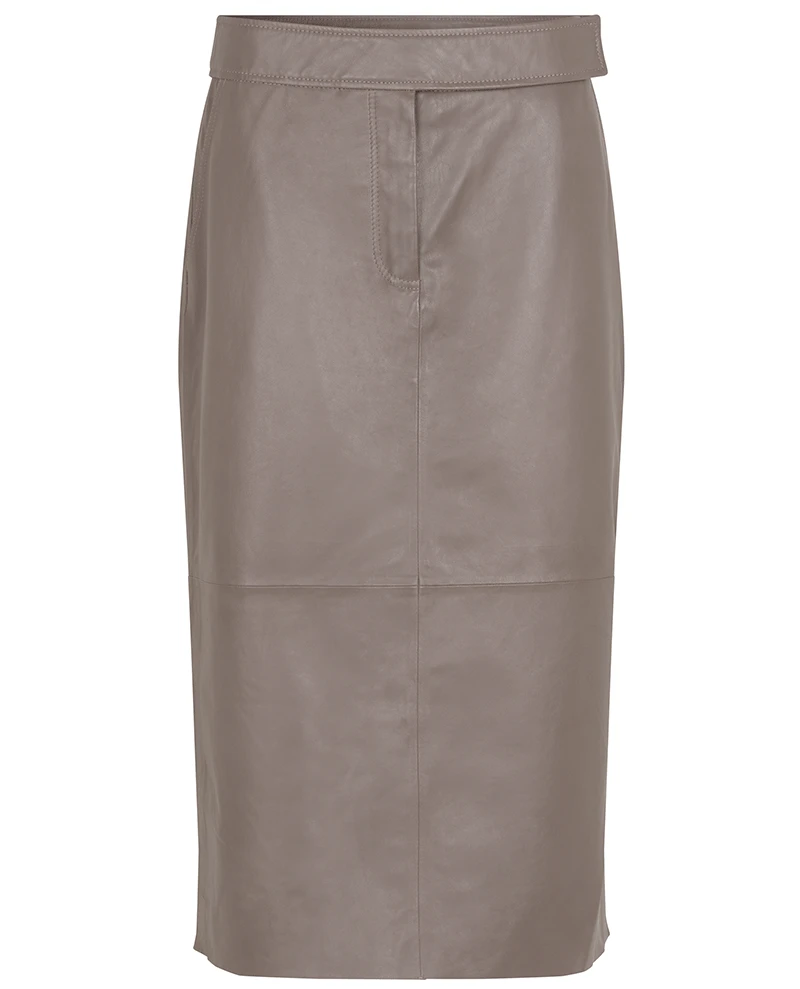 Second Female Francie Cinder Leather Skirt, a soft lambs leather midi skirt with a high slit at the side and a wide waistband. Fastening with a button and fly this mid length leather pencil skirt is a beautiful shade of mushroom brown.