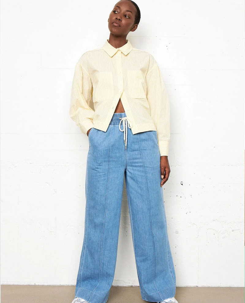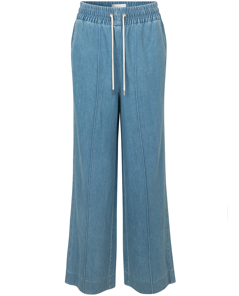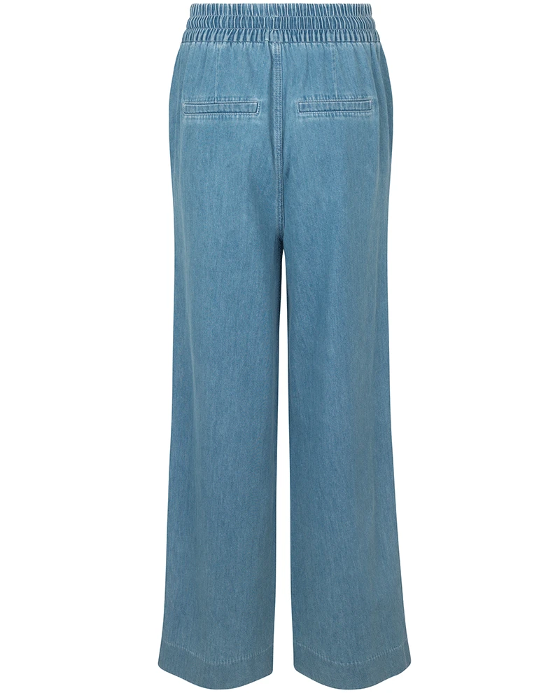 Second Female Ingrid Denim Trousers, wide leg flared trouser with elasticated waist and drawstring detail. Complete with pockets in the sides and decorative folds going all the way down the leg. Fake Pockets to back