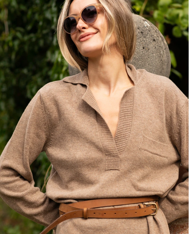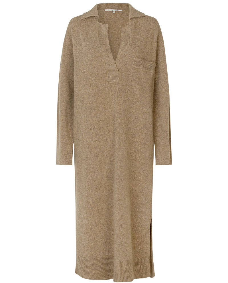Second Female Jagoda Brown Knit Dress, a long, relaxed fitting midi dress in earthy brown tone. With long sleeves, side split and v-neck detail to front, the Jagoda Dress is finished with a collar and single breast pocket.