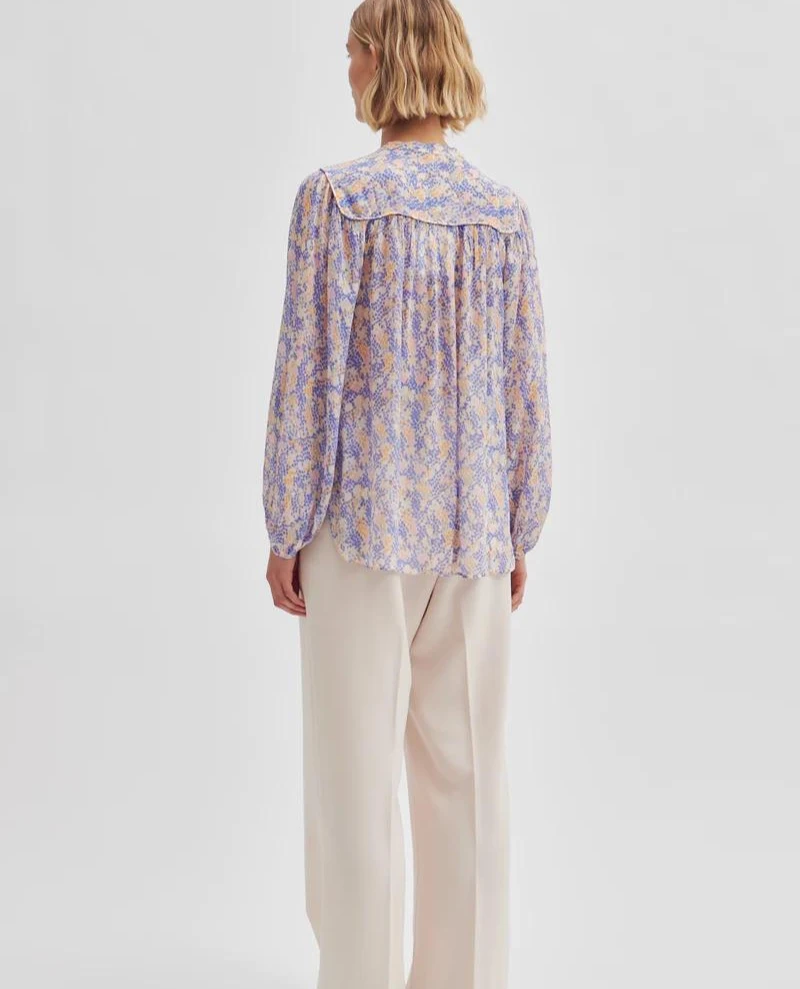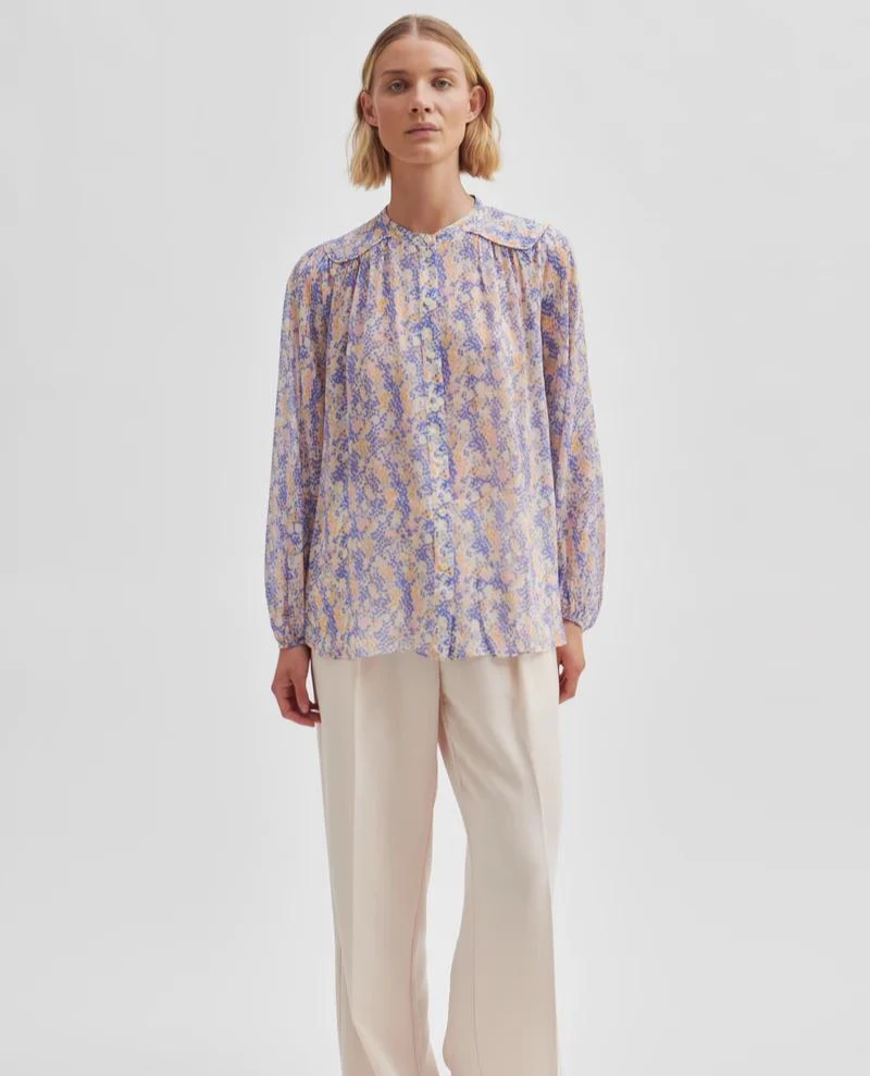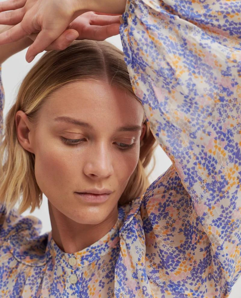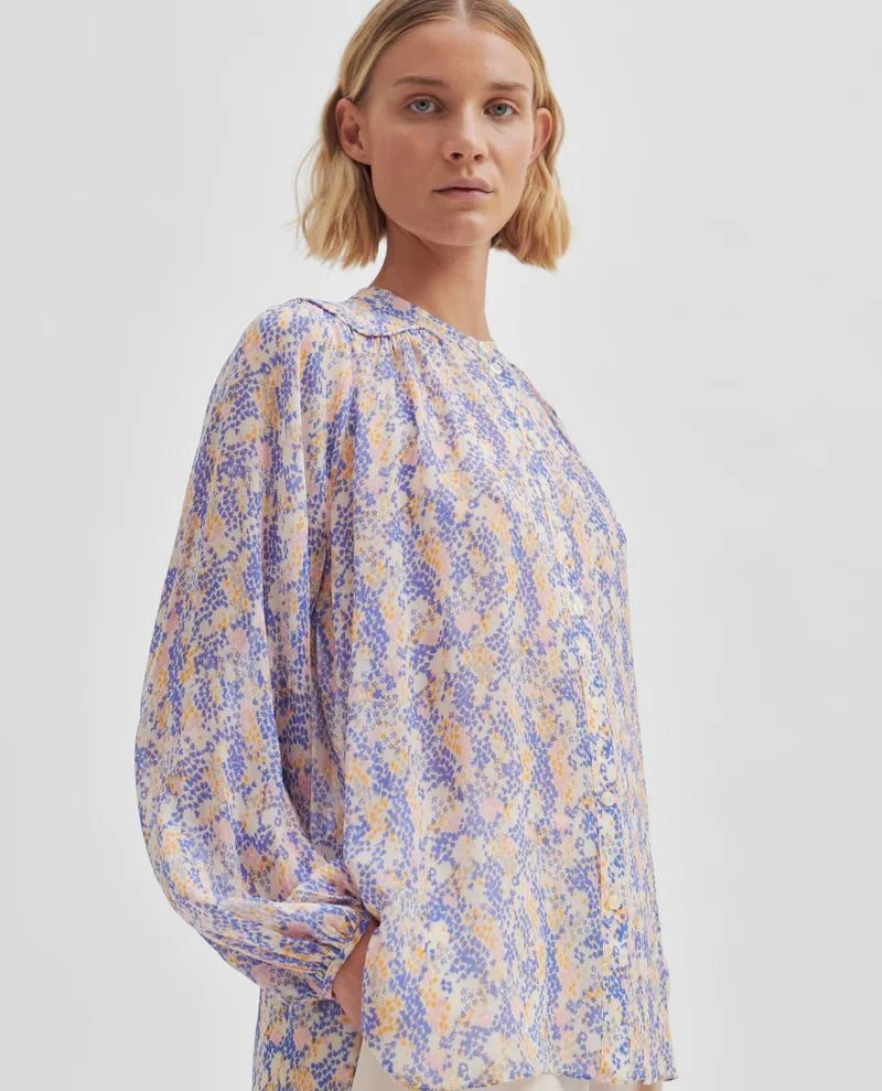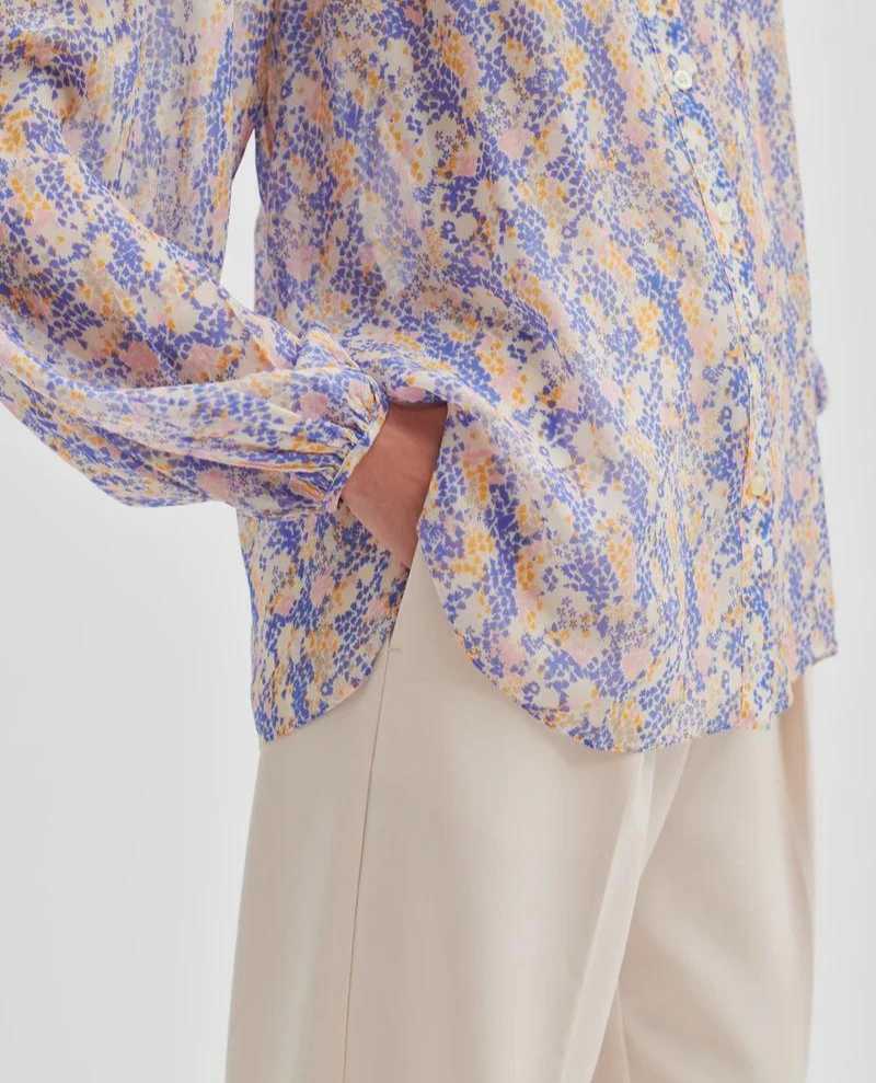 Second Female Poppi Amparo Blue Shirt, a feminine and fluid patterned shirt in gentle blue tones. With a relaxed fit, the Poppi features a rounded neckline, button down front and voluminous balloon style sleeves.