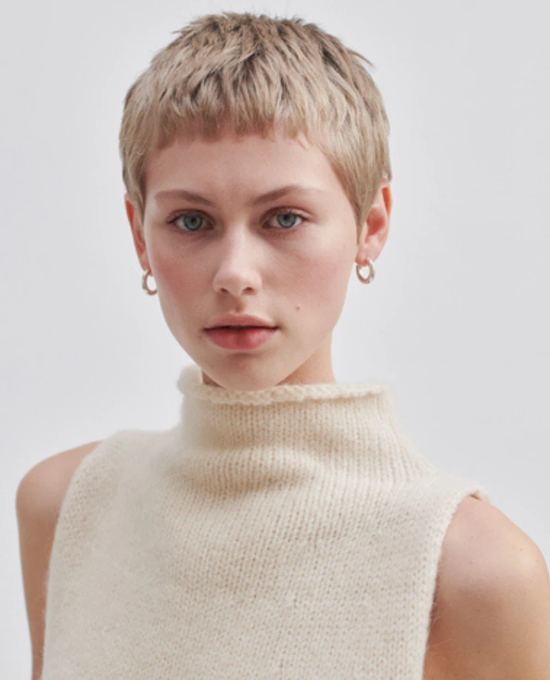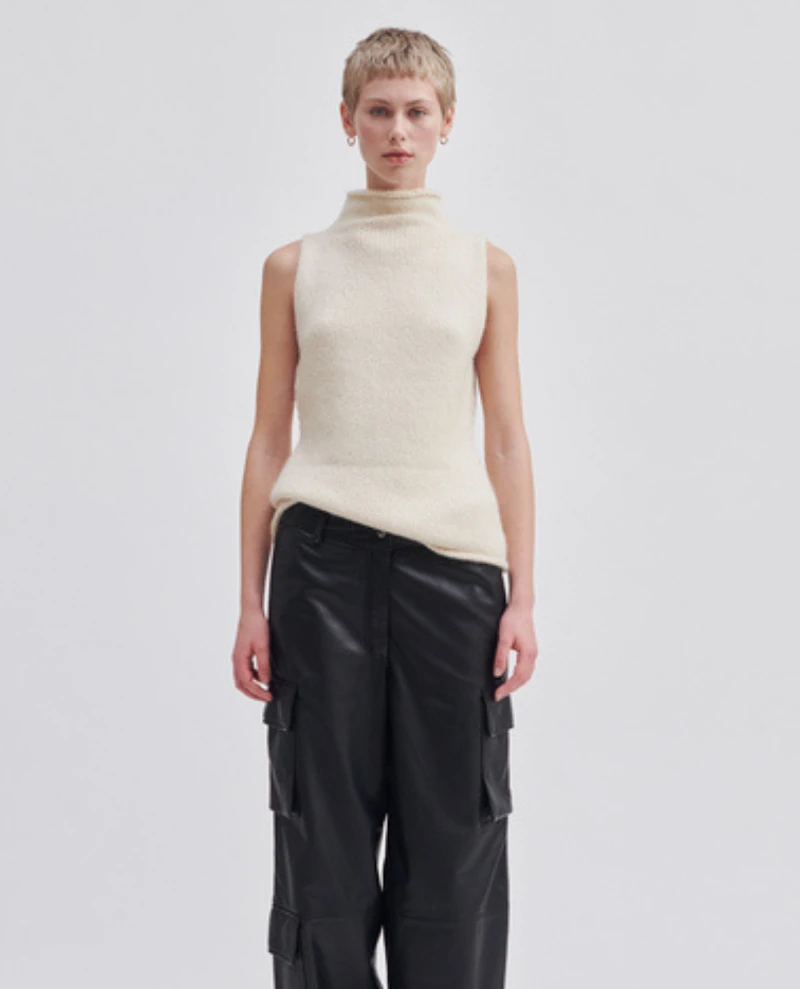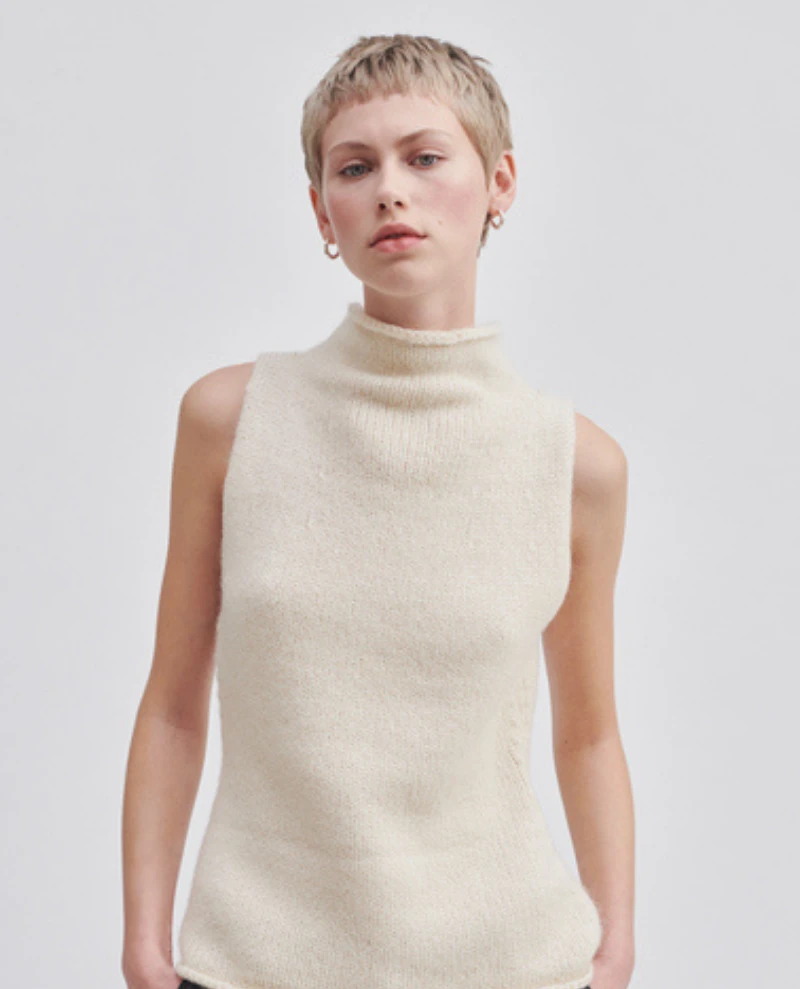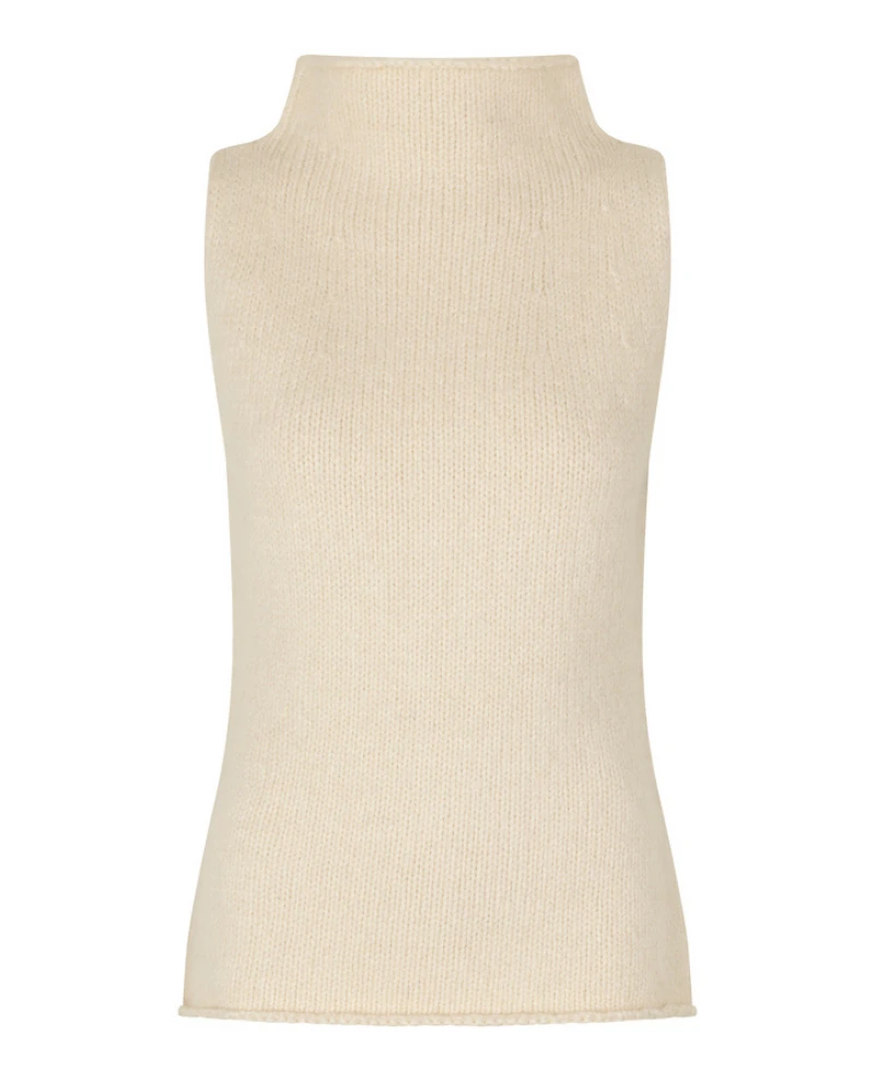 The Second Female Rikke Chalk Knit is a versatile sleeveless vest with a warm cream hue. Crafted from a knit fabric, this piece features a funnel neckline that is perfect for layering. Create a stylish and effortless ensemble with this essential wardrobe staple.