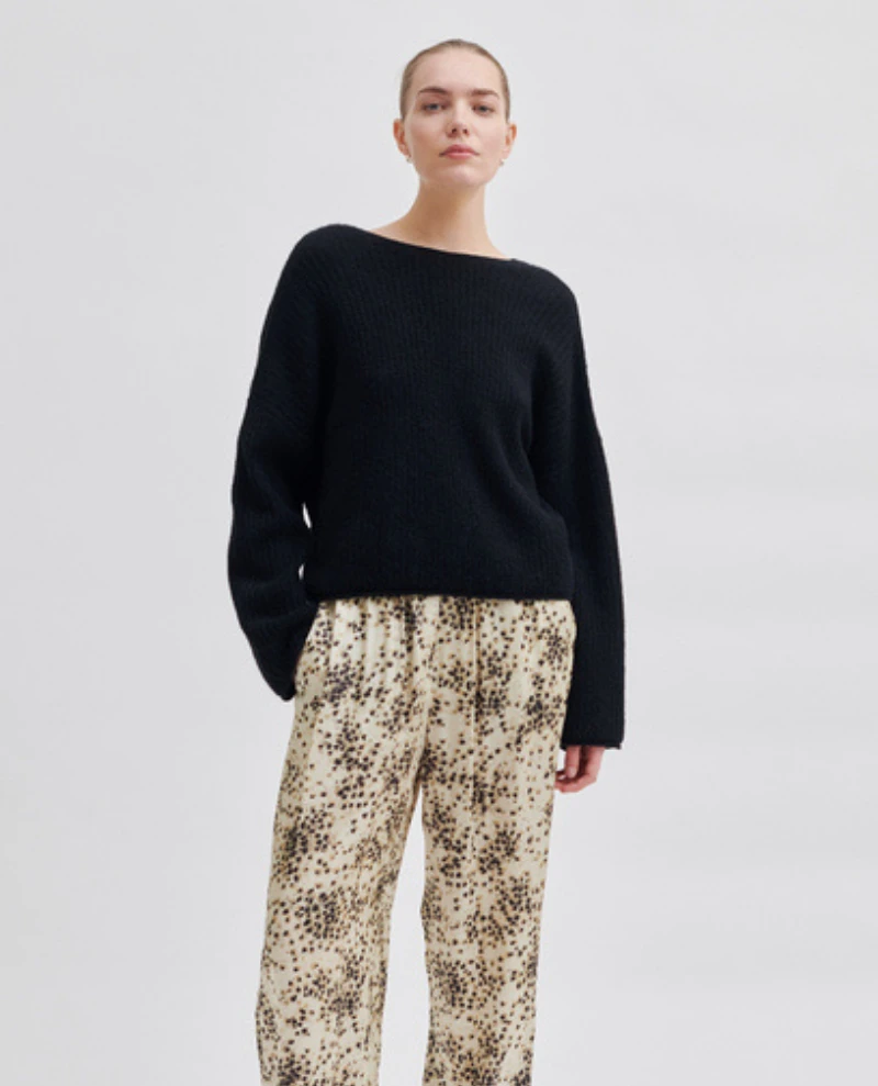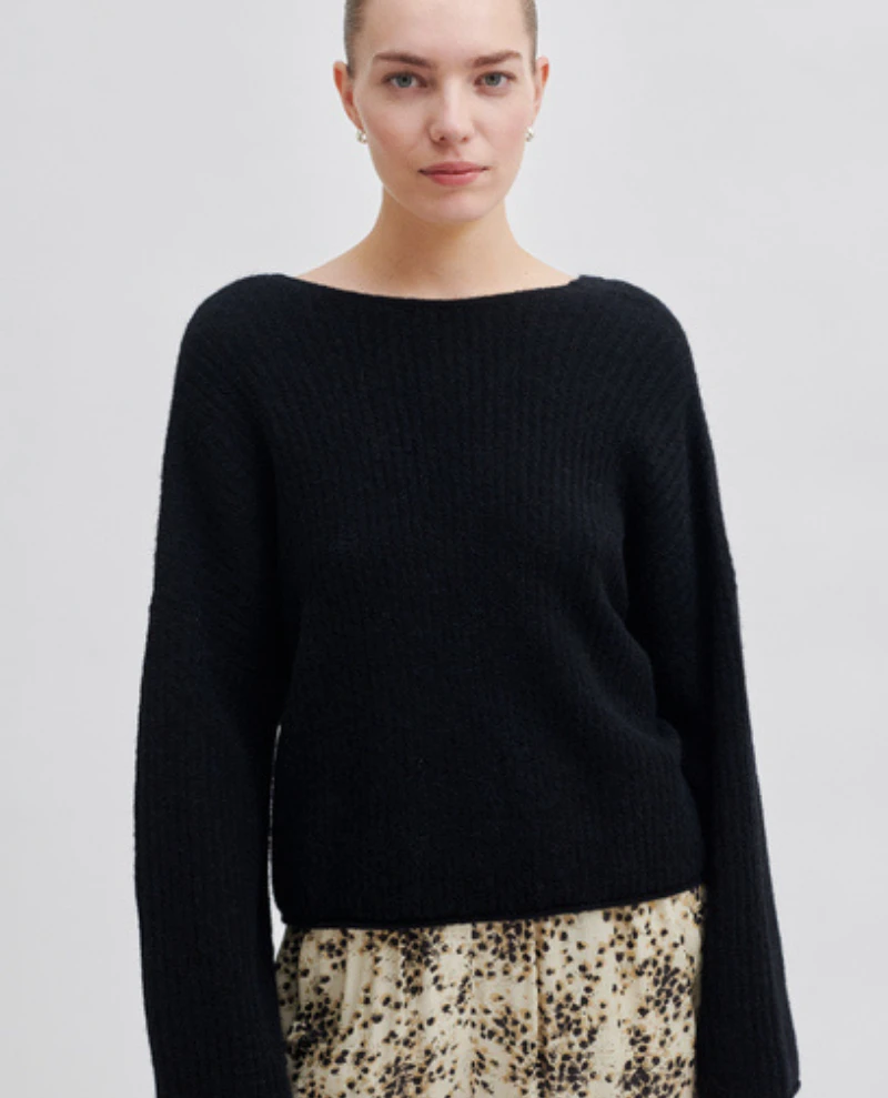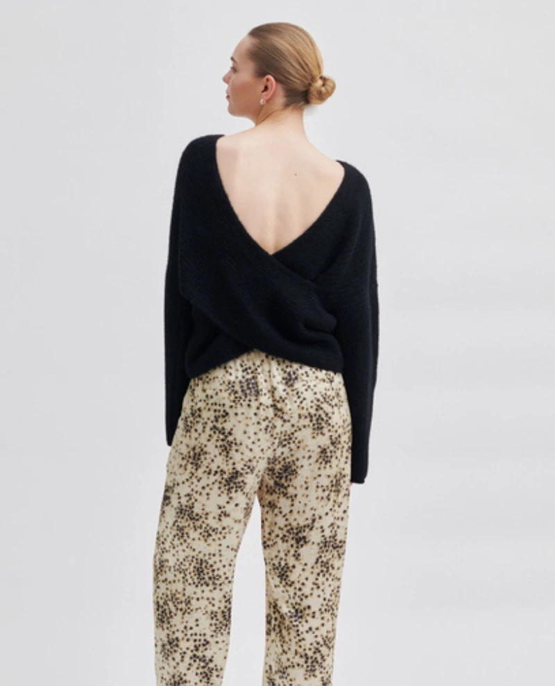 The Second Female Ymma Black Knit is ideal for adding a modern touch to any wardrobe. Its versatile design can be worn both ways, with a rounded neckline and a stylish cross-back detail. This lightweight yet warm knit also features long sleeves for added elegance. Perfect for any occasion.