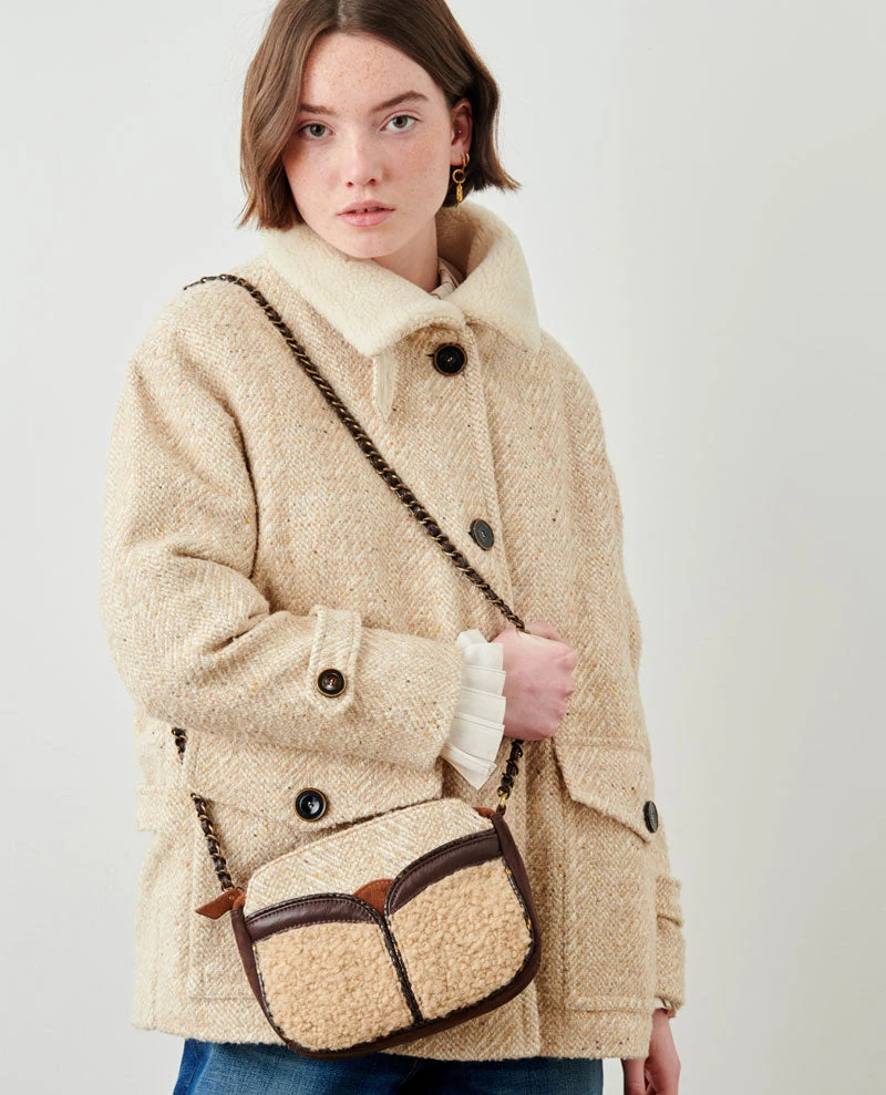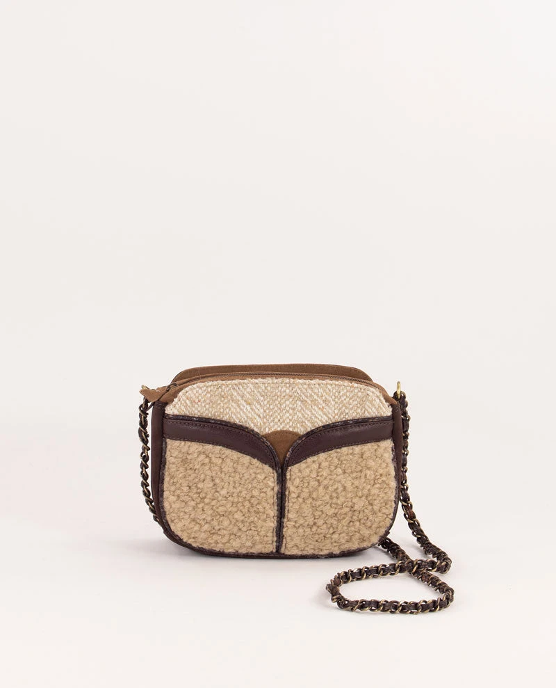 Sessun Divine Almond Bag, a lovely multi tone natural bag. In a rectangular shape, the Divine Almond bag has a thin cross body strap.