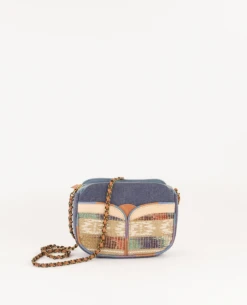 Sessun Divine Blue Canvas Bag, a rounded handbag in neutral and blue tones. With zipped opening, the Divine Bag is complete with chain shoulder strap.