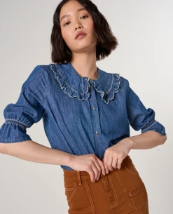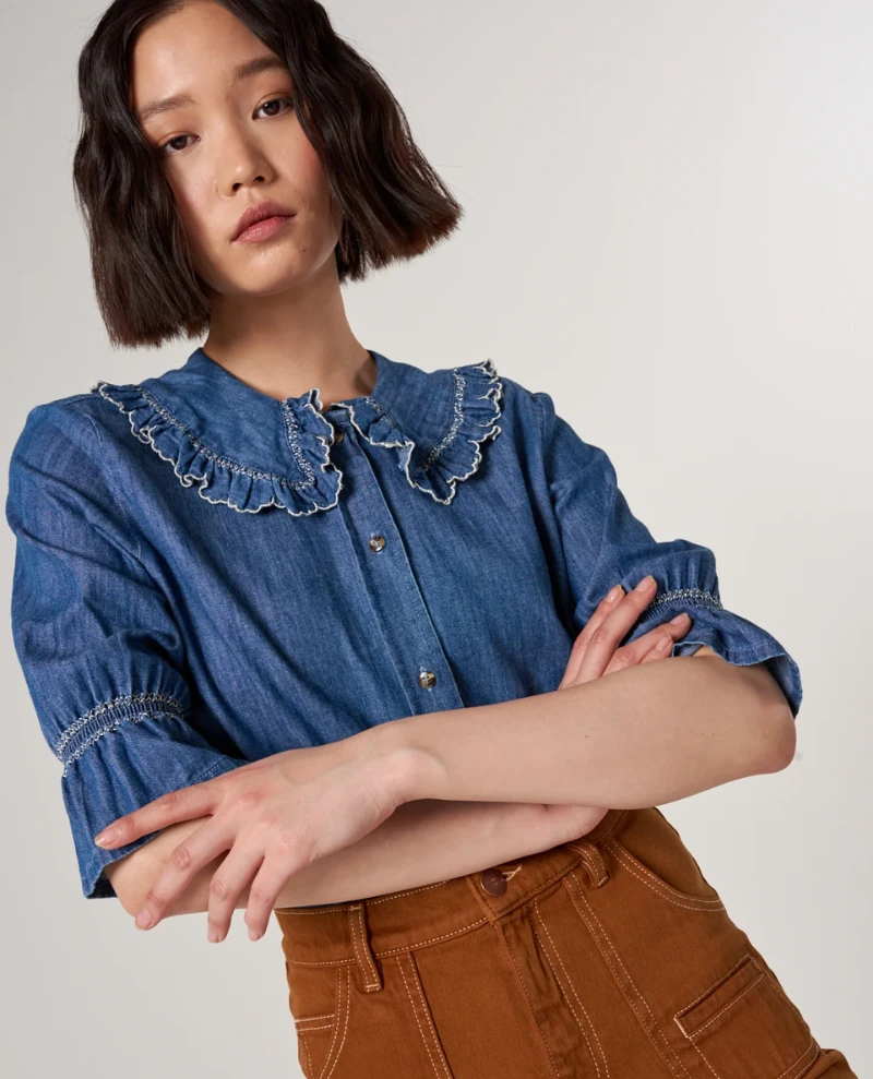 The Seventy and Mochi Daisy Indigo Blue Denim Blouse is a stylish and sustainable choice for everyday outfitting. Crafted from a certified organic and viscose blend, this blouse features a cropped sleeve and peek-a-boo collar for an effortlessly chic look. Layer it over a roll-neck or wear it on its own for a sophisticated finish.