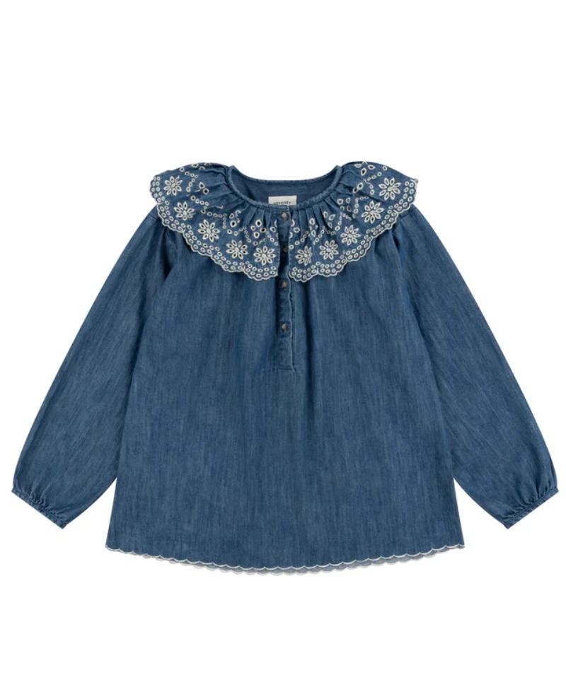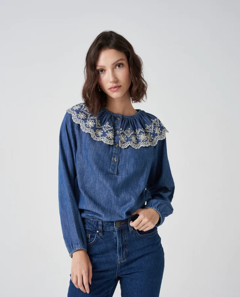 Seventy + Mochi Dylan Indigo Blouse, a whimsical blouse with statement collar which is versatile in a dark wash with contrast stitching. Made from a blend of certified organic and recycled cotton, the Dylan blouse has a button down half-placket to the front.