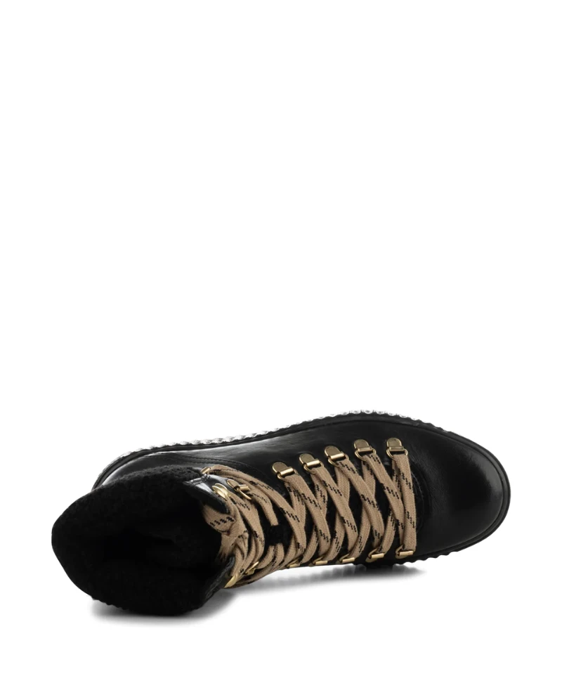 Shoe The Bear Agda Warm Lined Black Boot, a hiking style inspired boot. In deep black tone, the Agda boot is perfect for year round wear – featuring a sturdy rubber sole, contrast laces and hook and D-ring fastenings.