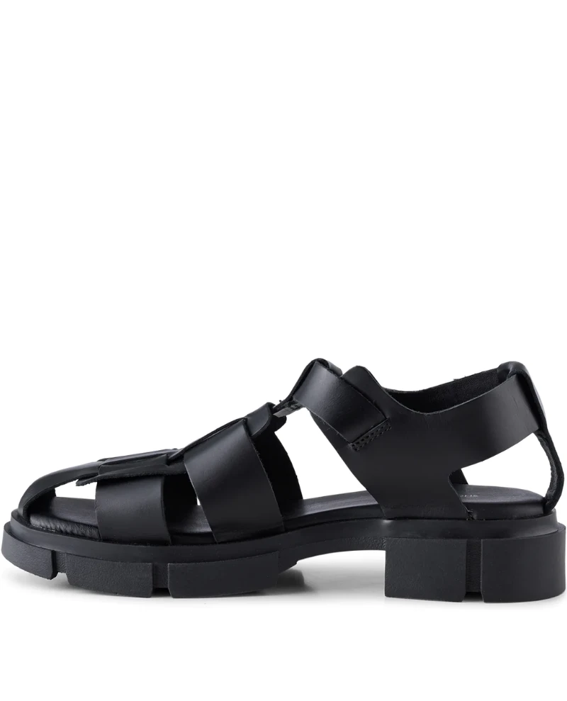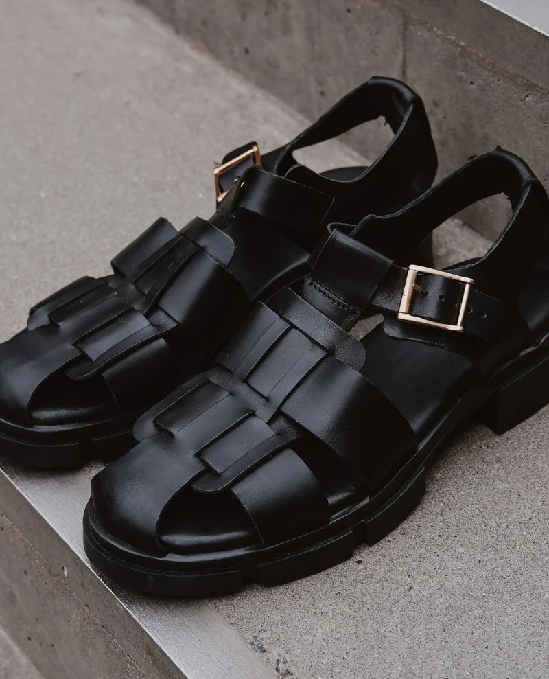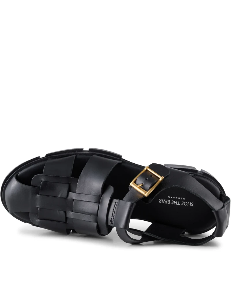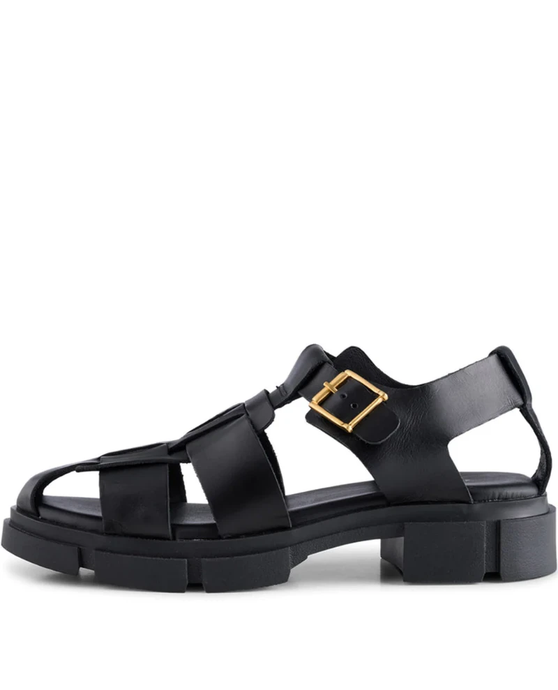 Shoe The Bear Alva Fisherman Black Leather Sandal, a go-to sandal during the warm months. The Alva sandal has a track sole, beautiful cage-style upper and a gold-tone metal buckle. Style them with your favourite summer dress.