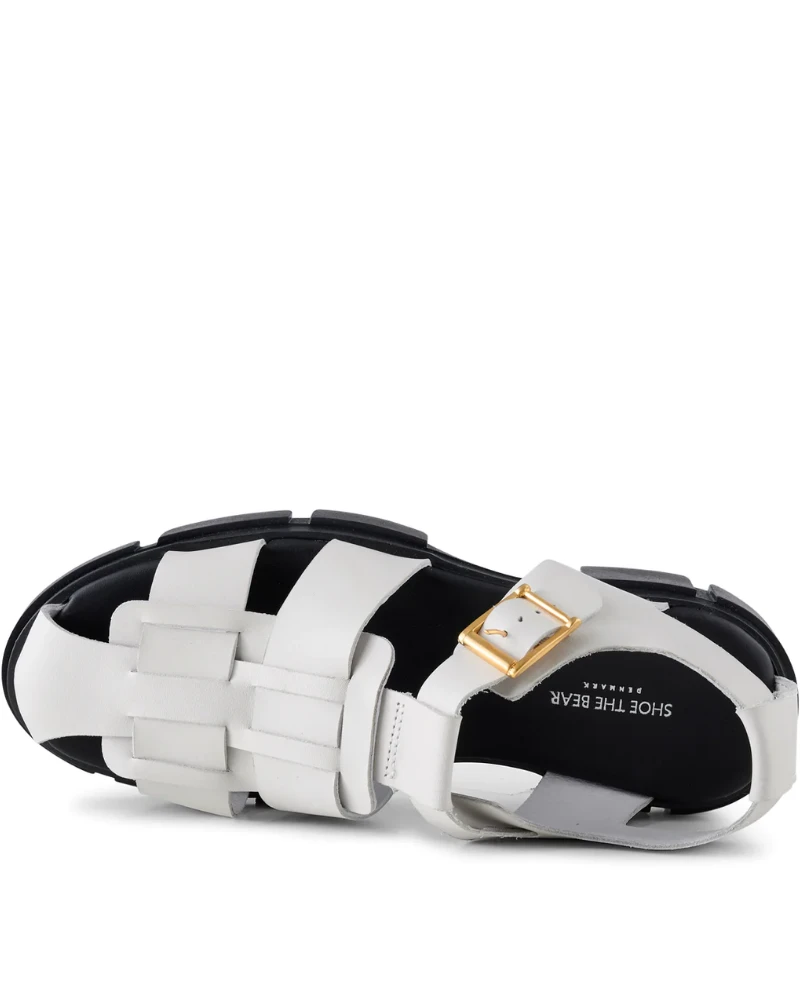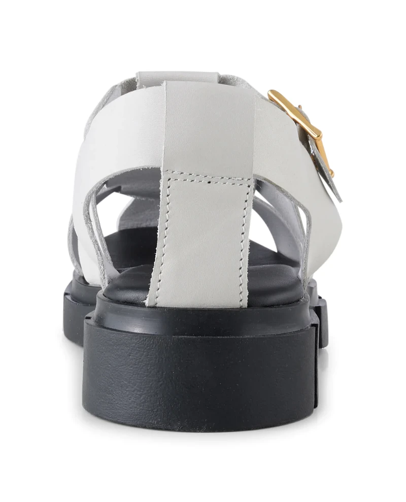 Shoe The Bear Alva Fisherman White Leather Sandal, a go-to sandal during the warm months. The White Alva sandal has a black track sole, beautiful cage-style upper and a gold-tone metal buckle. Style them with your favourite summer dress.