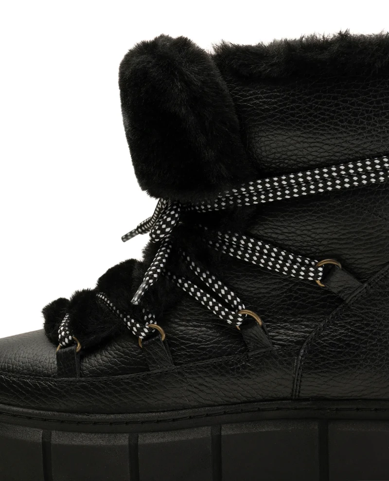Shoe The Bear Tove Black Snow Boots, an innovative, cool, and warm boot made in Portugal with 100 percent LWG certified leather. This chunky shoe features a beautiful string design and a versatile chunky sole. With mountain boot style laces.