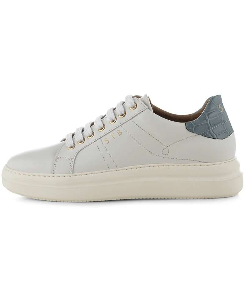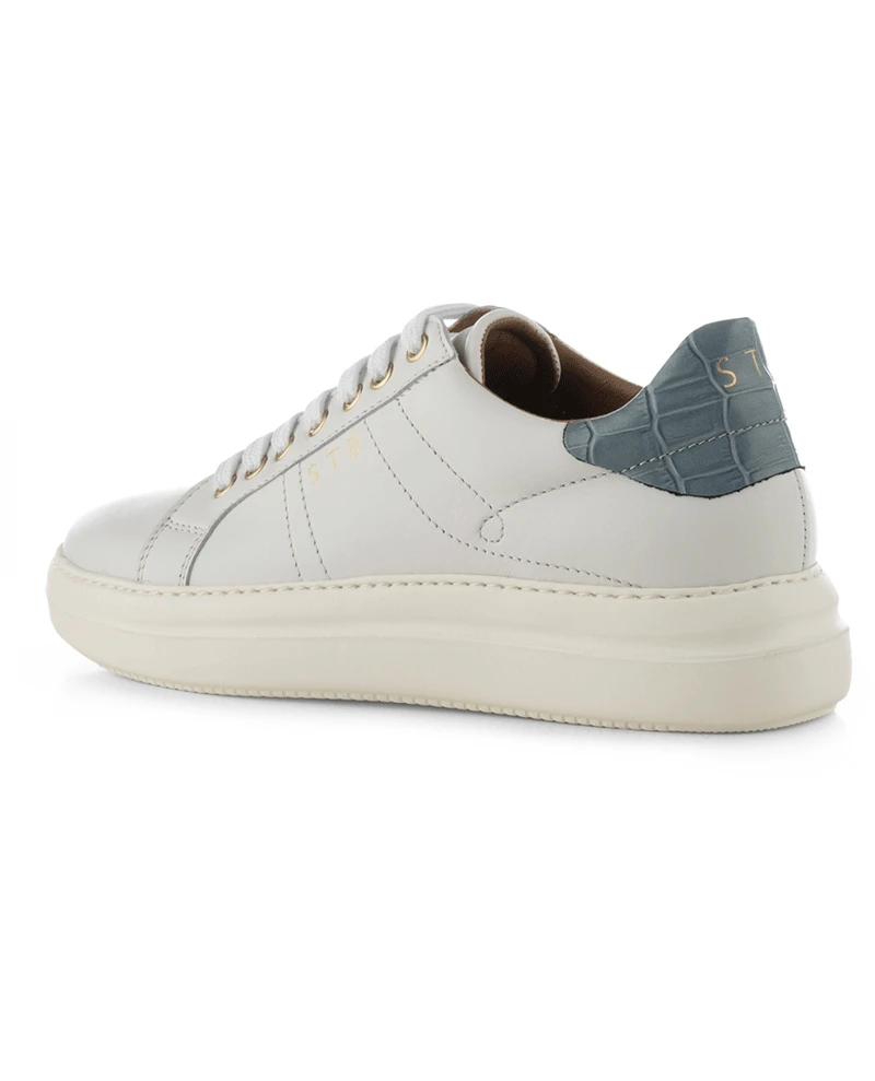 Shoe The Bear Valda Blue Croc Trainers, a white pair of lace up leather sneakers with a light blue faux crocodile skin heel. Complete with a thick white rubber sole and white laces that lace up through gold eyelets these contemporary everyday training shoes are made for comfort and style. Also available with a red or lilac ankle.