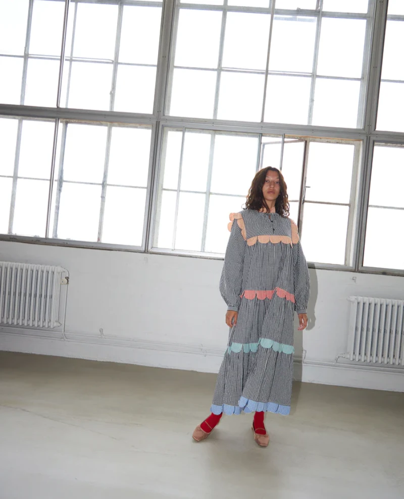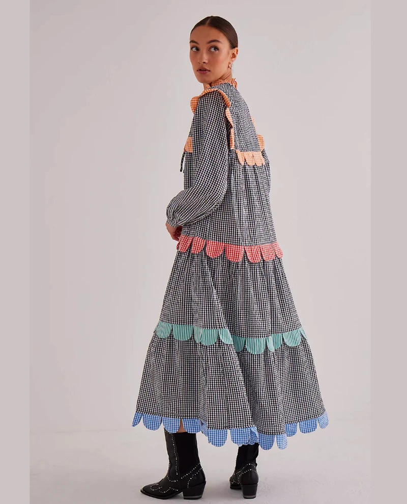 Stella Nova Loan Black Checked Dress, a long casual dress in small checkered material. Tougue-shaped frills in different colors down the body and on the collar. Long sleeves and chest closure with both buttons and a drawstring.