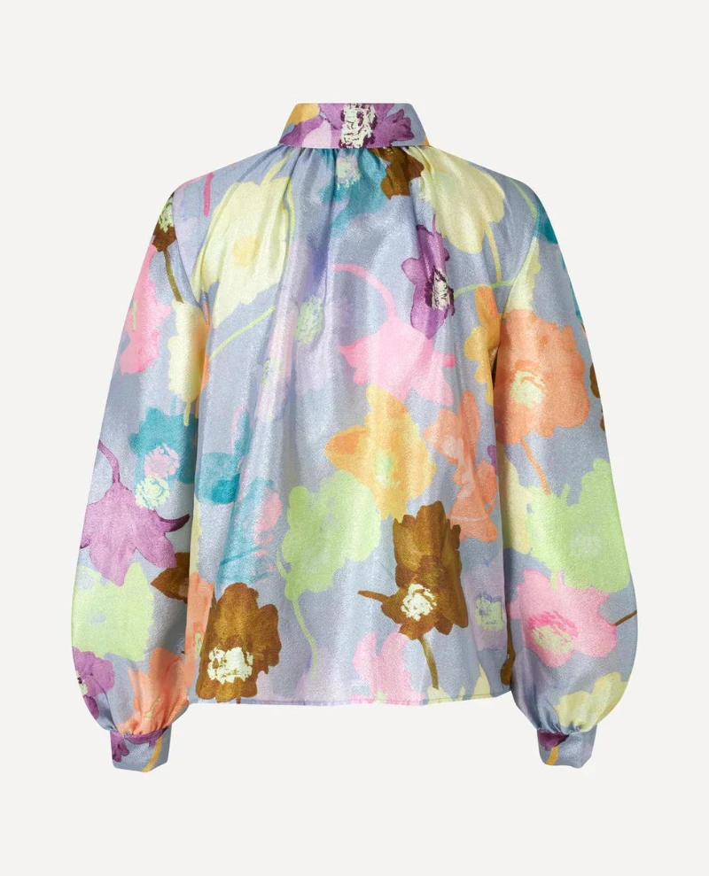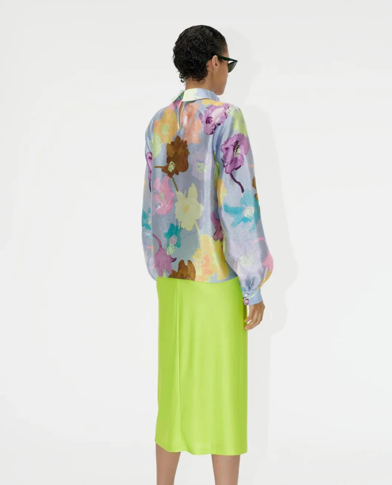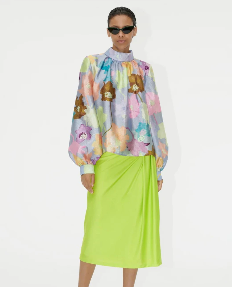 Stine Goya Ashley Filigram Flower Blouse, a silky turtleneck blouse with a relaxed fit and loose, voluminous cuffed sleeves. Pair with sleek tailoring or your favourite denim.