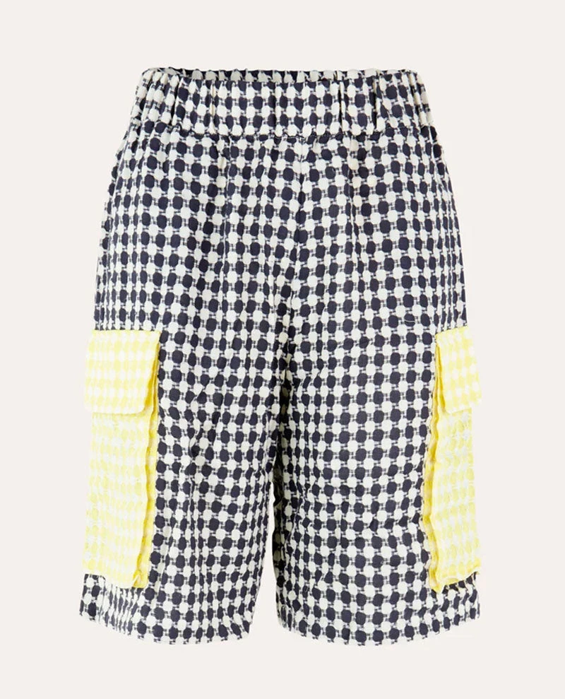 Stine Goya Camila Check Short, a black and white checkerboard style short with statement yellow pocket detail to sides. With a relaxed fit and elasticated waistband for added comfort.