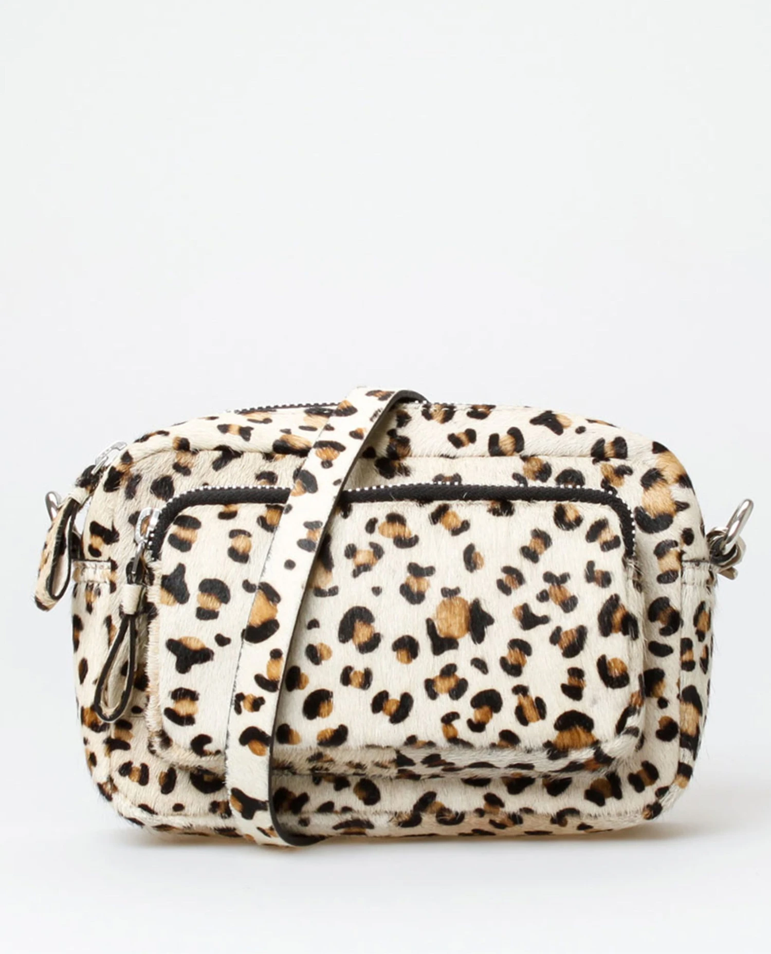 Treats Vera Leopard Bag, a small furry leopard print bag with an adjustable and removable shoulder strap and an external zipped pocket. This fully lined brown lopard print bag has internal pockets.