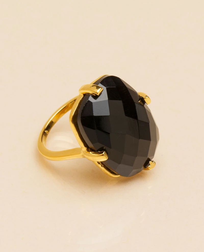 Une A Une Black Onyx Rectangular Ring, a 925 silver bases ring plated in 18 carat yellow gold. With a large, semi-precious black onyx stone in rectangular shape, faceted cabochon, and bezel set.