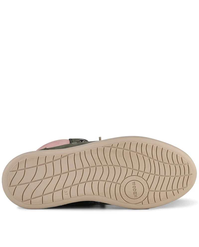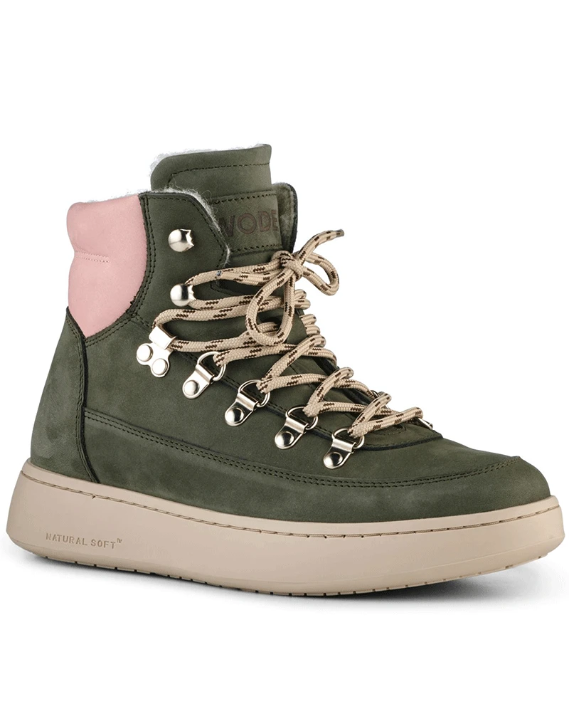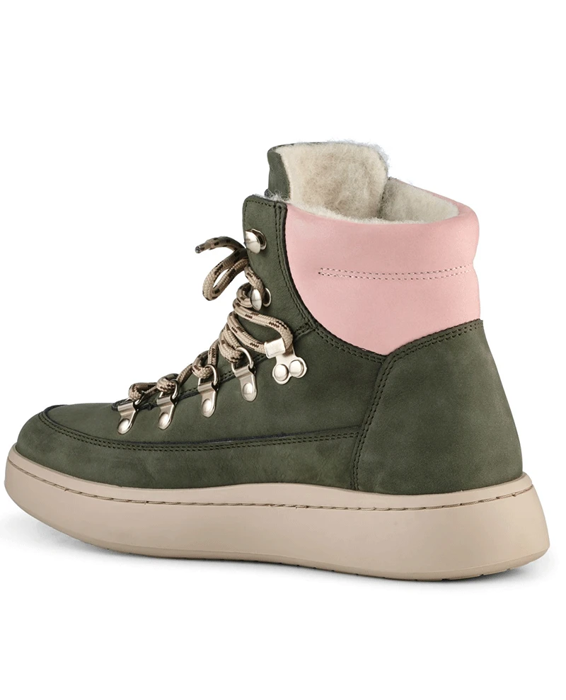 Woden Iris Nubuck Green Boots, a green pair of suede lace up boots with a thick rubber sole. The shock absorbing natural rubber soles are lined with cork making them light, breathable and soft. Lined with real wool these suede and leather boots also come in brown.