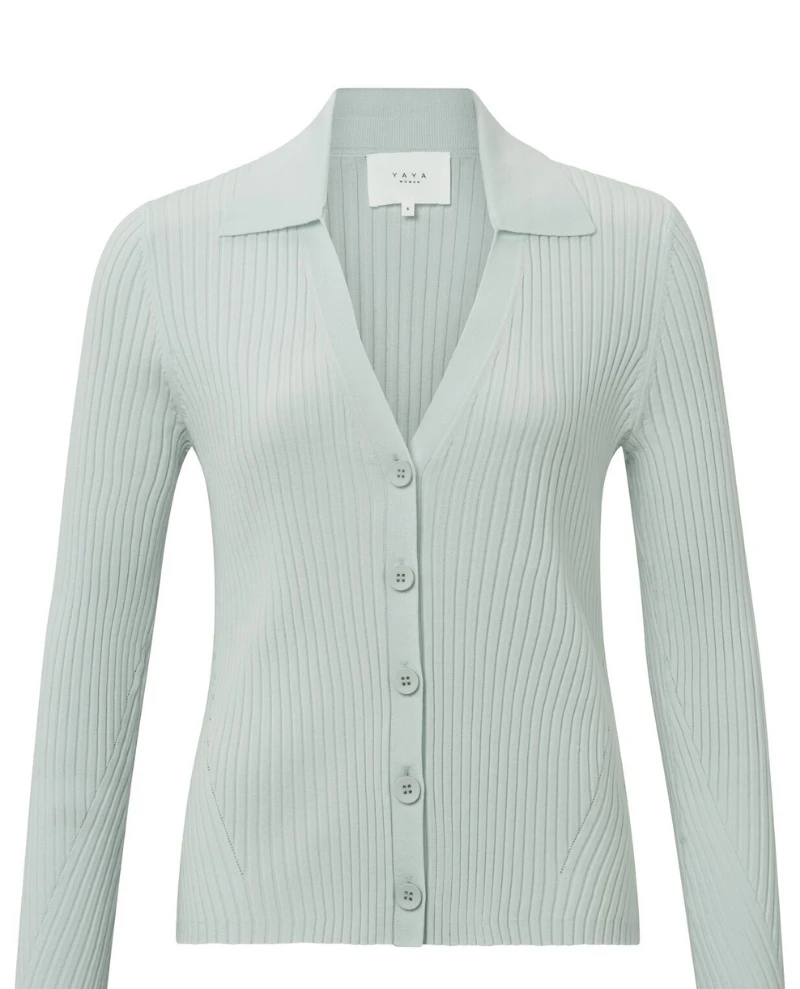Yaya Droplet Grey Cardigan, a lightweight knit with buttoned fastening. In a neutral grey tone, this cardigan has a wide rib finish with a relaxed collar and long, straight sleeves.