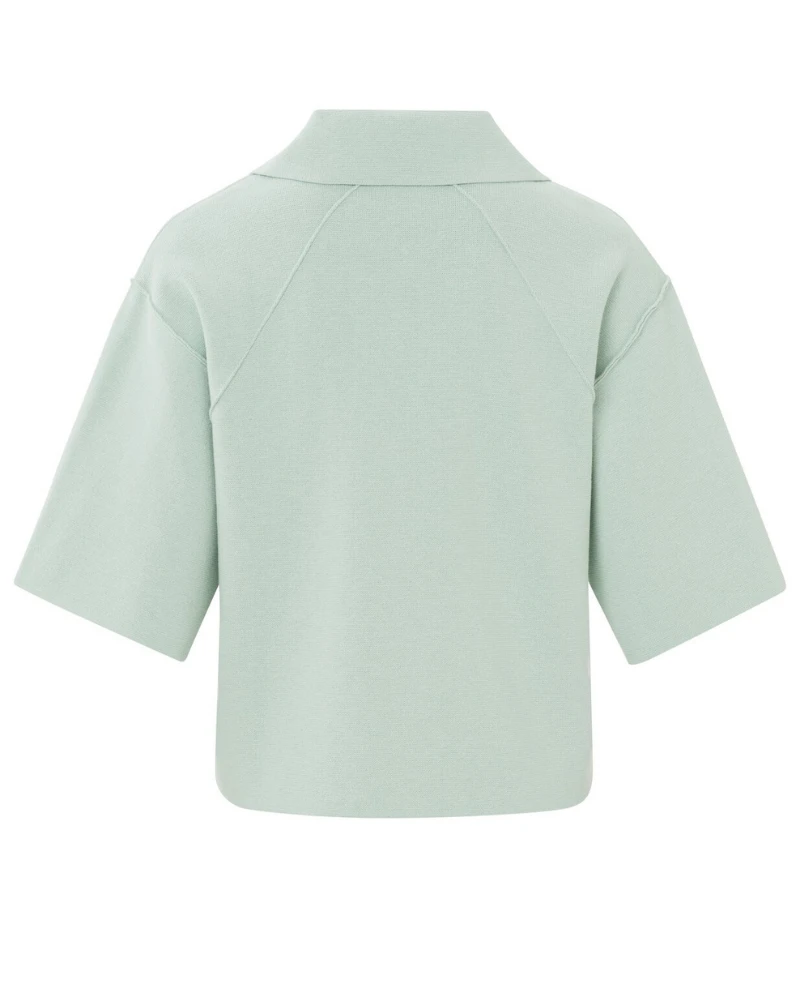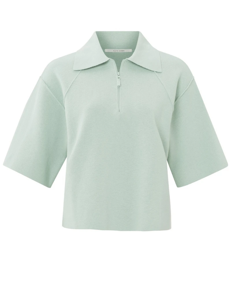 Yaya Droplet Grey Polo Sweater, a preppy style knitted sweater in a grey-green tone. This sweater has a wide, half sleeve with a zip to the front and wide collar detail.