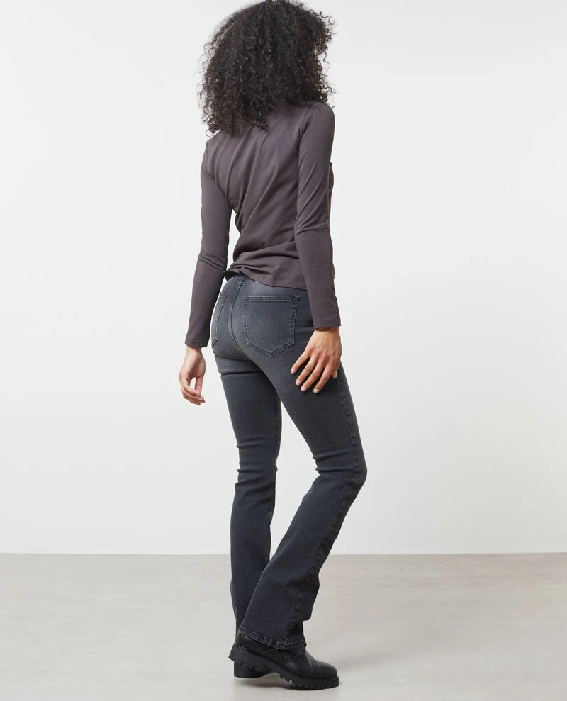 Yaya Grey Flare Denim Jean, a mid-rise comfortable jean. In a deep grey wash, these jeans are fitted at the thigh with a slight flare. Complete with classic zip and button closure and belt loops.